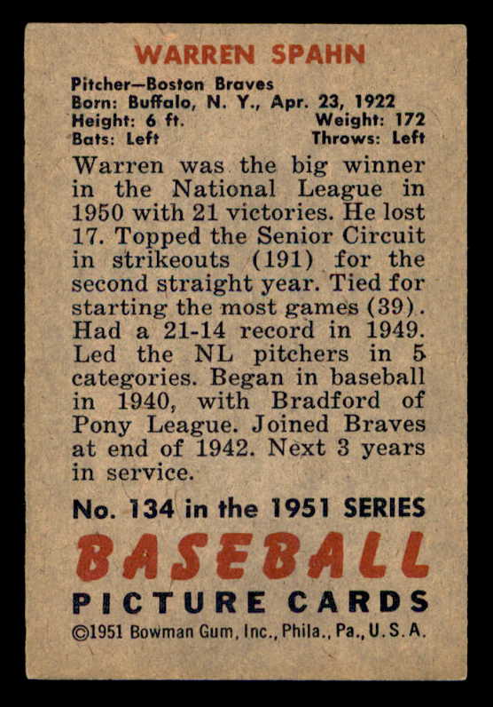 1951 Bowman Baseball #134 Warren Spahn Braves EX-MT 542405