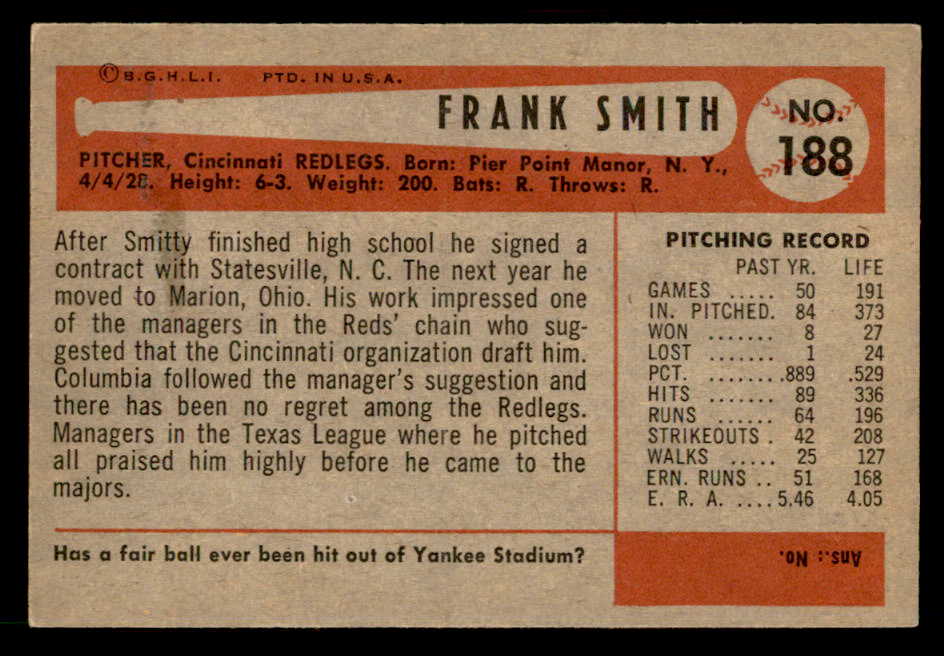 1954 Bowman Baseball #188 Frank Smith Reds EX-MT 542381