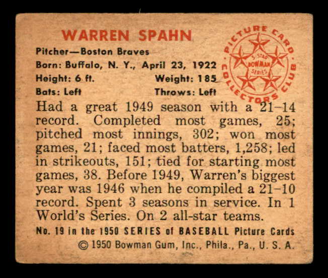 1950 Bowman Baseball #019 Warren Spahn Braves VG-EX 541885