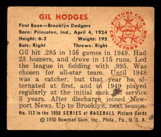 1950 Bowman Baseball #112 Gil Hodges Dodgers FR-GD 545892