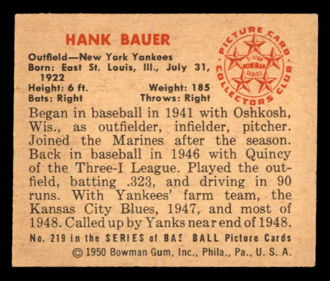 1950 Bowman Baseball #219 Hank Bauer Yankees EX-MT 541883