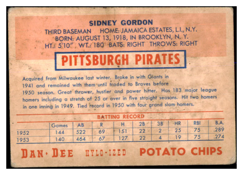 1954 Dan Dee Sid Gordon Pirates VG-EX 431161