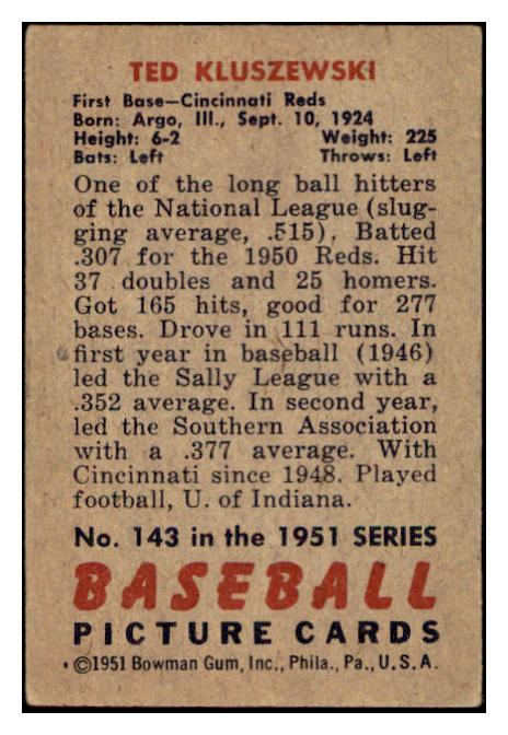 1951 Bowman Baseball #143 Ted Kluszewski Reds VG-EX 530852