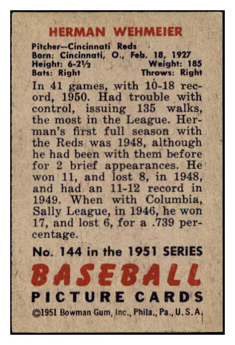 1951 Bowman Baseball #144 Herman Wehmeier Reds EX-MT 531449