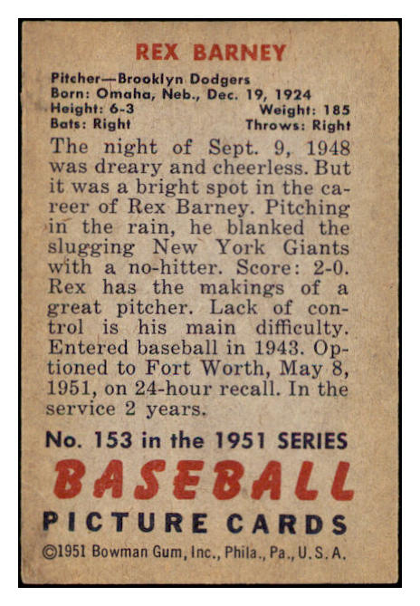 1951 Bowman Baseball #153 Rex Barney Dodgers EX-MT 531446