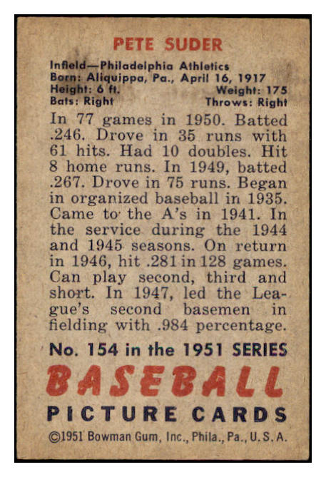 1951 Bowman Baseball #154 Pete Suder A's EX-MT 531445