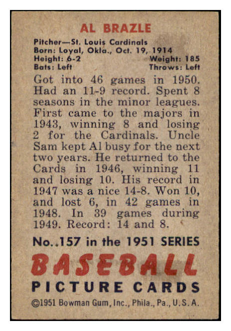 1951 Bowman Baseball #157 Al Brazle Cardinals EX-MT 531442