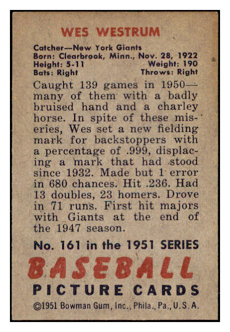 1951 Bowman Baseball #161 Wes Westrum Giants EX-MT 531440