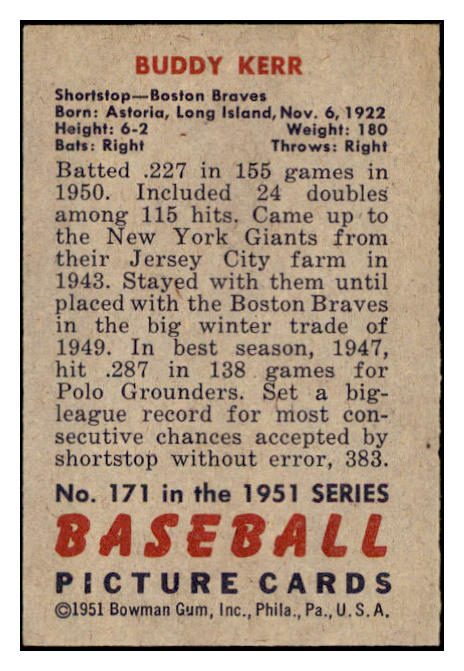 1951 Bowman Baseball #171 Buddy Kerr Braves EX-MT 531437