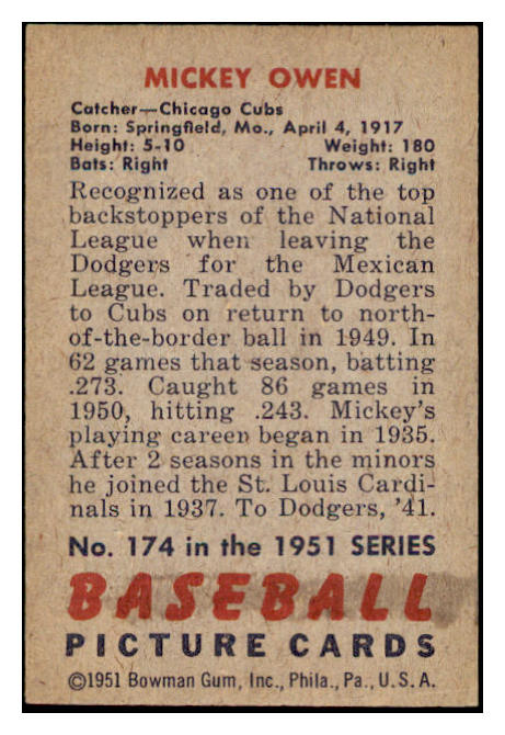 1951 Bowman Baseball #174 Mickey Owen Cubs EX-MT 531436