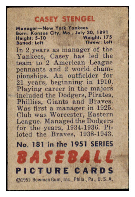 1951 Bowman Baseball #181 Casey Stengel Yankees EX 530854