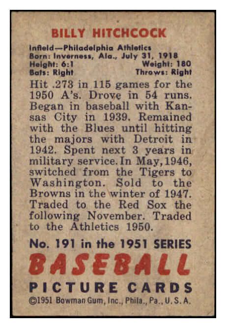 1951 Bowman Baseball #191 Billy Hitchcock A's EX-MT 531406