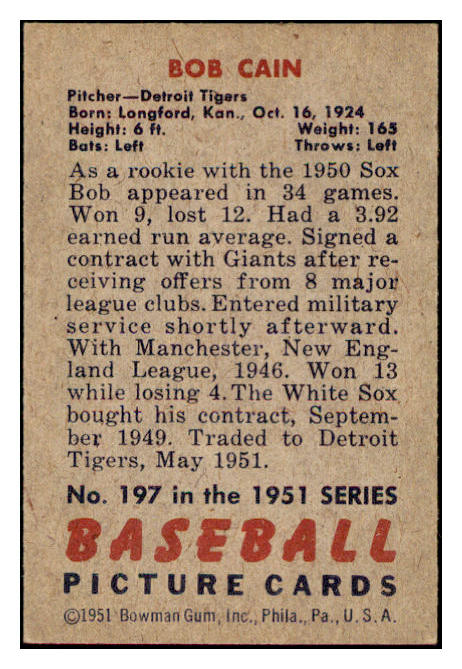 1951 Bowman Baseball #197 Bob Cain Tigers EX-MT 531404