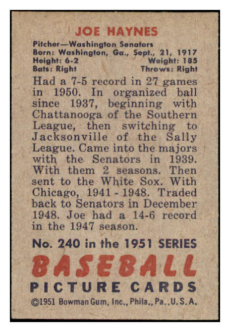 1951 Bowman Baseball #240 Joe Haynes Senators EX-MT 531390