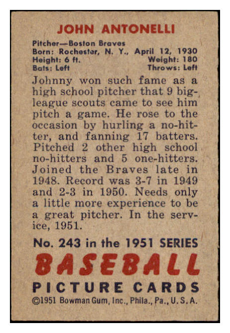 1951 Bowman Baseball #243 John Antonelli Braves EX-MT 531347