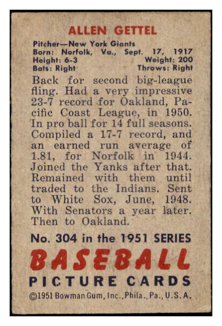 1951 Bowman Baseball #304 Allen Gettel Giants VG-EX 530877