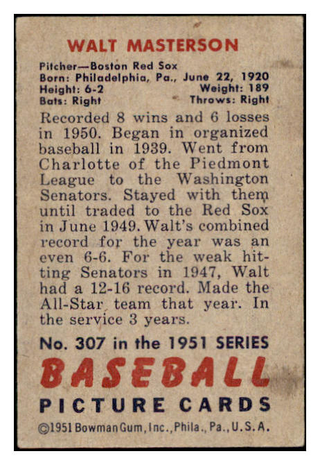 1951 Bowman Baseball #307 Walt Masterson Red Sox EX-MT 531357