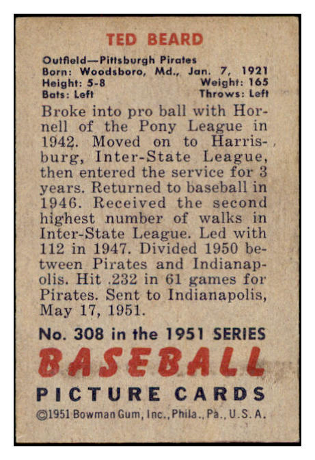 1951 Bowman Baseball #308 Ted Beard Pirates EX-MT 531356