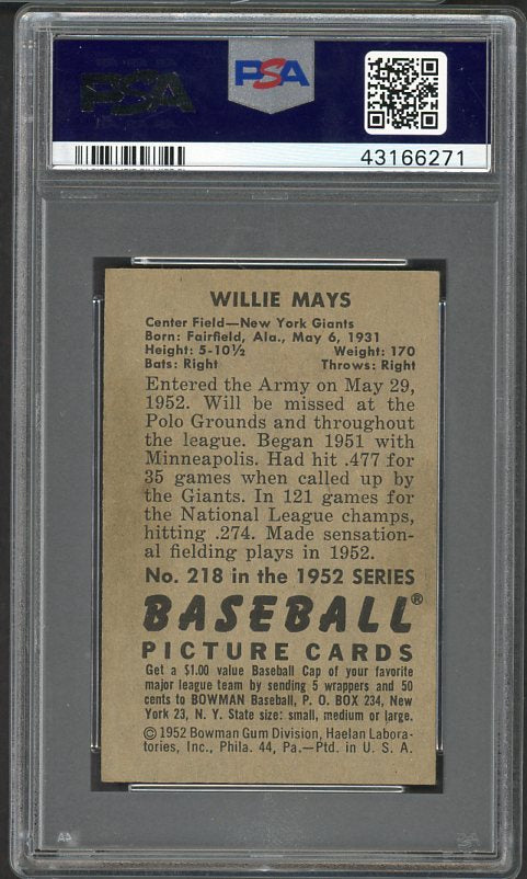 1952 Bowman #218 Willie Mays Giants PSA 2 GD 537895