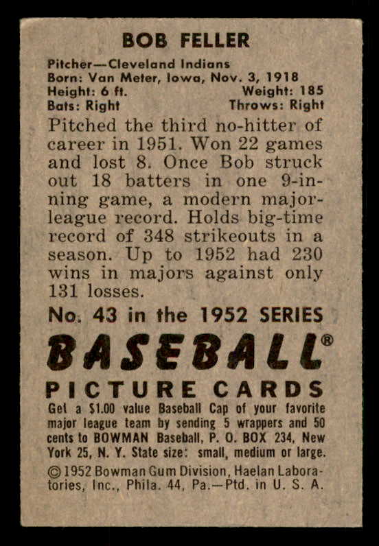 1952 Bowman Baseball #043 Bob Feller Indians VG-EX 548228