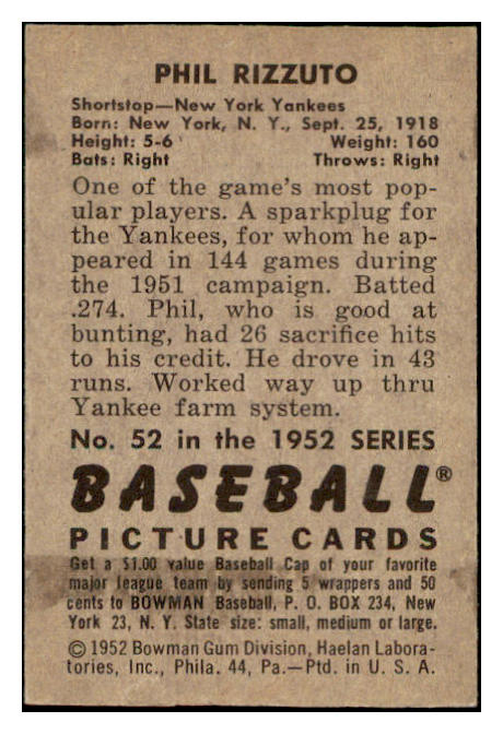 1952 Bowman Baseball #052 Phil Rizzuto Yankees EX-MT 531547