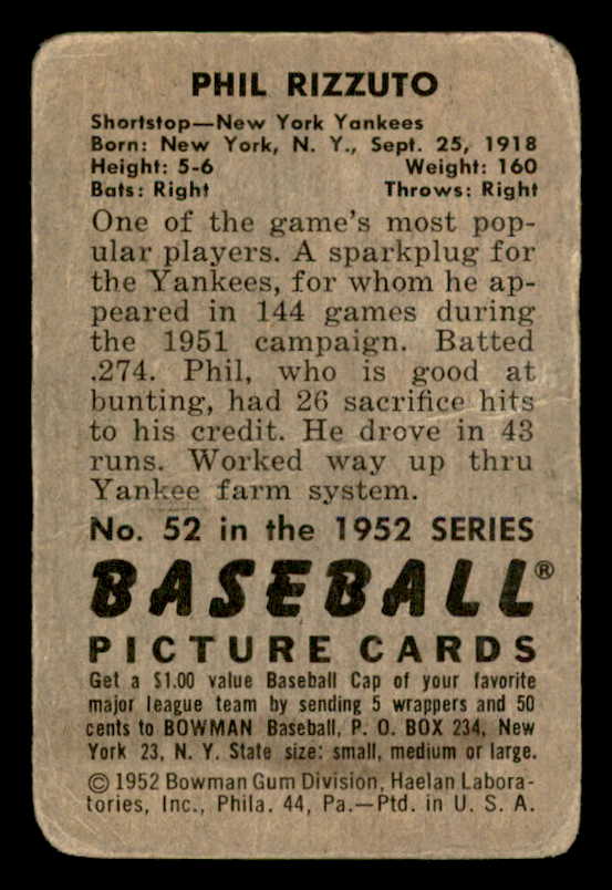 1952 Bowman Baseball #052 Phil Rizzuto Yankees Good 541895