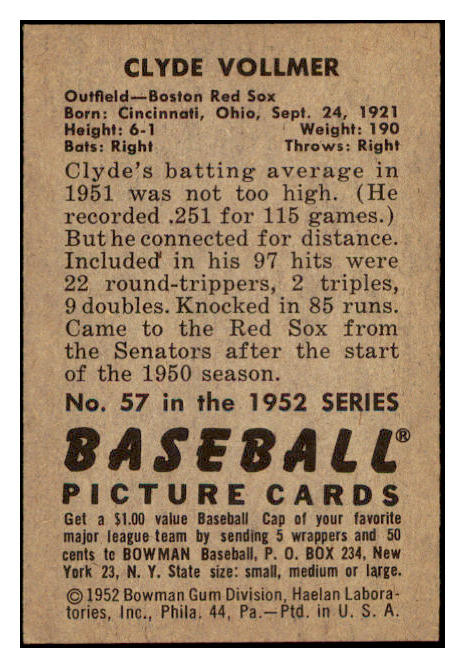 1952 Bowman Baseball #057 Clyde Vollmer Red Sox EX-MT 531525