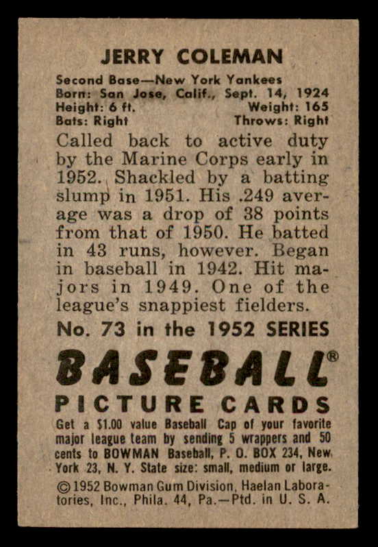 1952 Bowman Baseball #073 Jerry Coleman Yankees EX-MT 542038