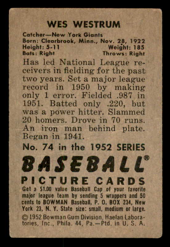 1952 Bowman Baseball #074 Wes Westrum Giants VG-EX 546731