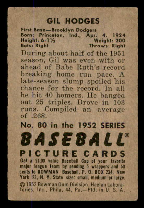 1952 Bowman Baseball #080 Gil Hodges Dodgers VG-EX 545907