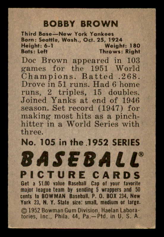 1952 Bowman Baseball #105 Bobby Brown Yankees EX-MT 542043
