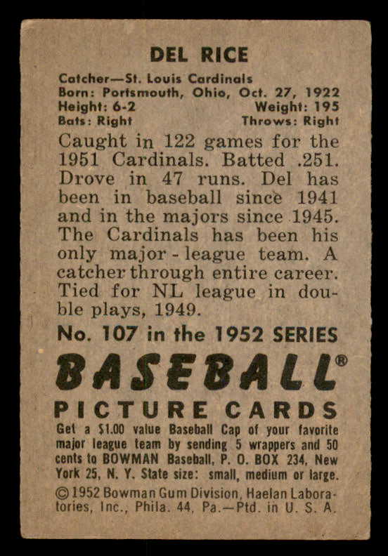 1952 Bowman Baseball #107 Del Rice Cardinals VG-EX 546732