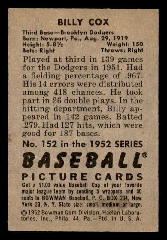 1952 Bowman Baseball #152 Billy Cox Dodgers EX-MT 542045