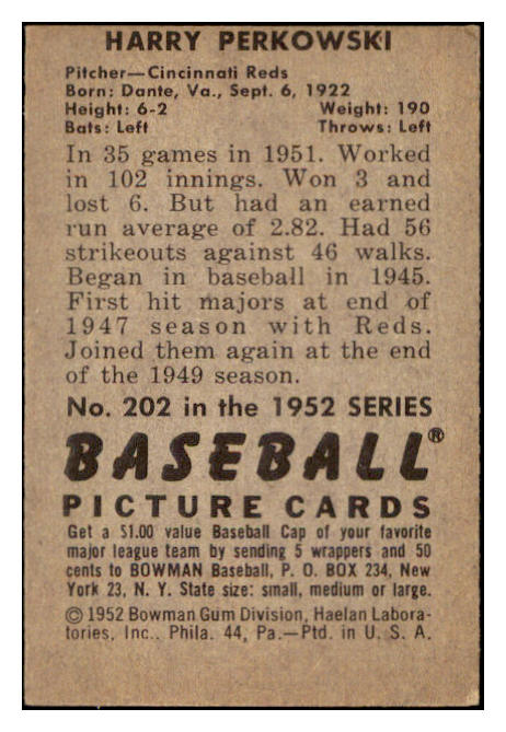 1952 Bowman Baseball #202 Harry Perkowski Reds EX-MT 531470
