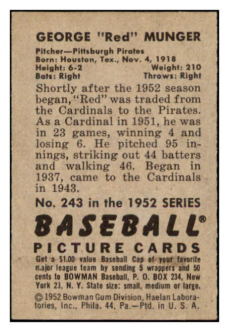 1952 Bowman Baseball #243 George Munger Pirates EX-MT 531496