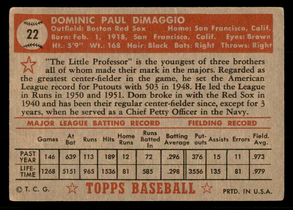 1952 Topps Baseball #022 Dom DiMaggio Red Sox VG Red 547633