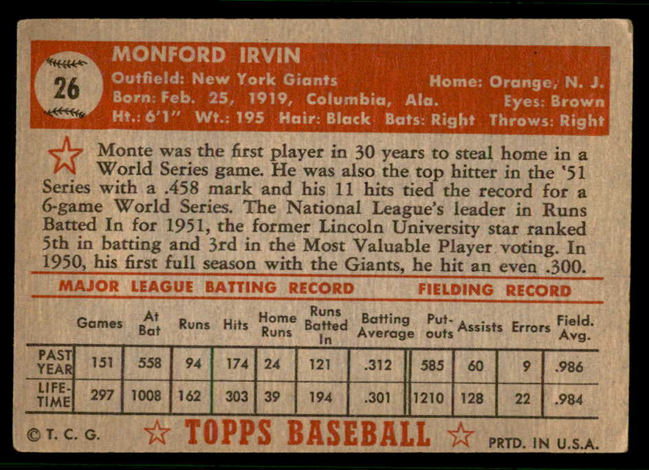 1952 Topps Baseball #026 Monte Irvin Giants VG-EX Red 541846