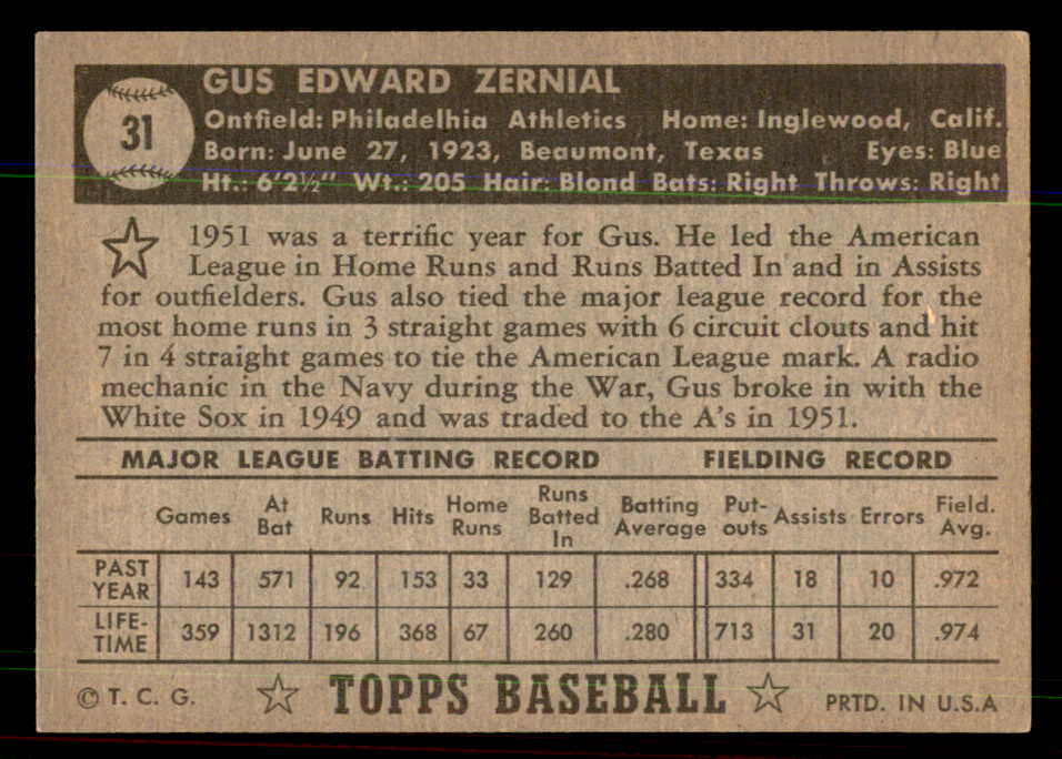 1952 Topps Baseball #031 Gus Zernial A's EX-MT Black 544123