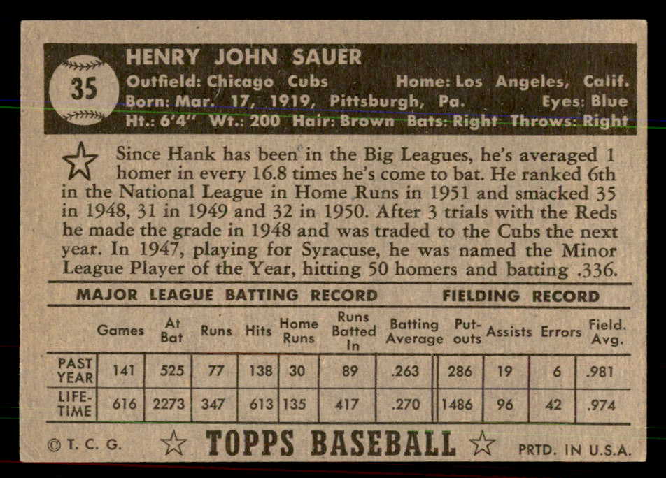 1952 Topps Baseball #035 Hank Sauer Cubs VG-EX Black 544126