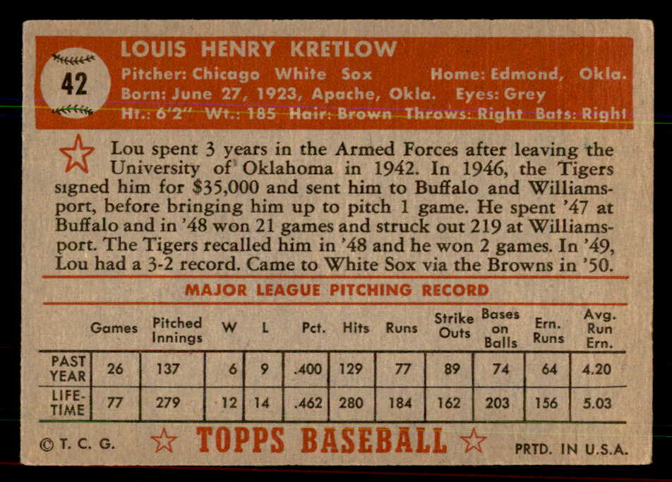 1952 Topps Baseball #042 Lou Kretlow White Sox VG-EX Red 544131
