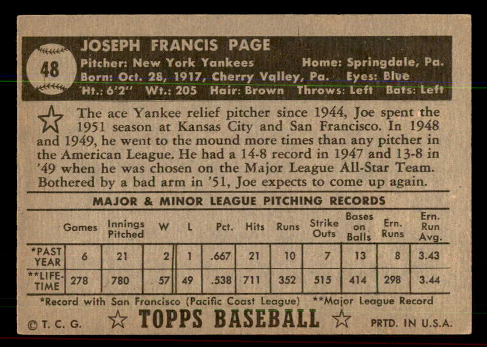 1952 Topps Baseball #048 Joe Page Yankees EX-MT Black 544134