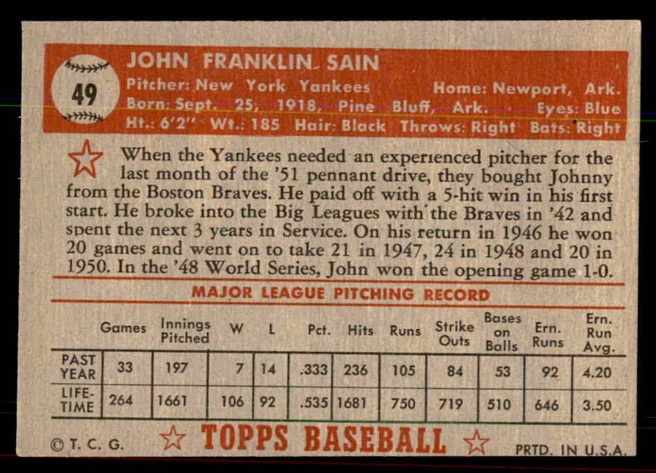 1952 Topps Baseball #049 Johnny Sain Yankees EX Red 544135