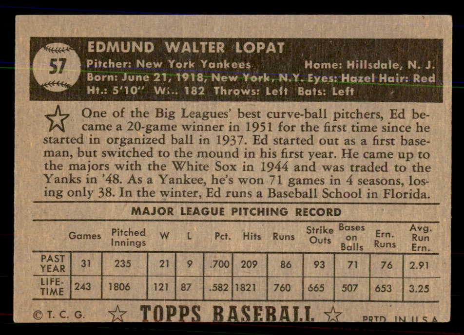 1952 Topps Baseball #057 Eddie Lopat Yankees VG-EX Black 544140