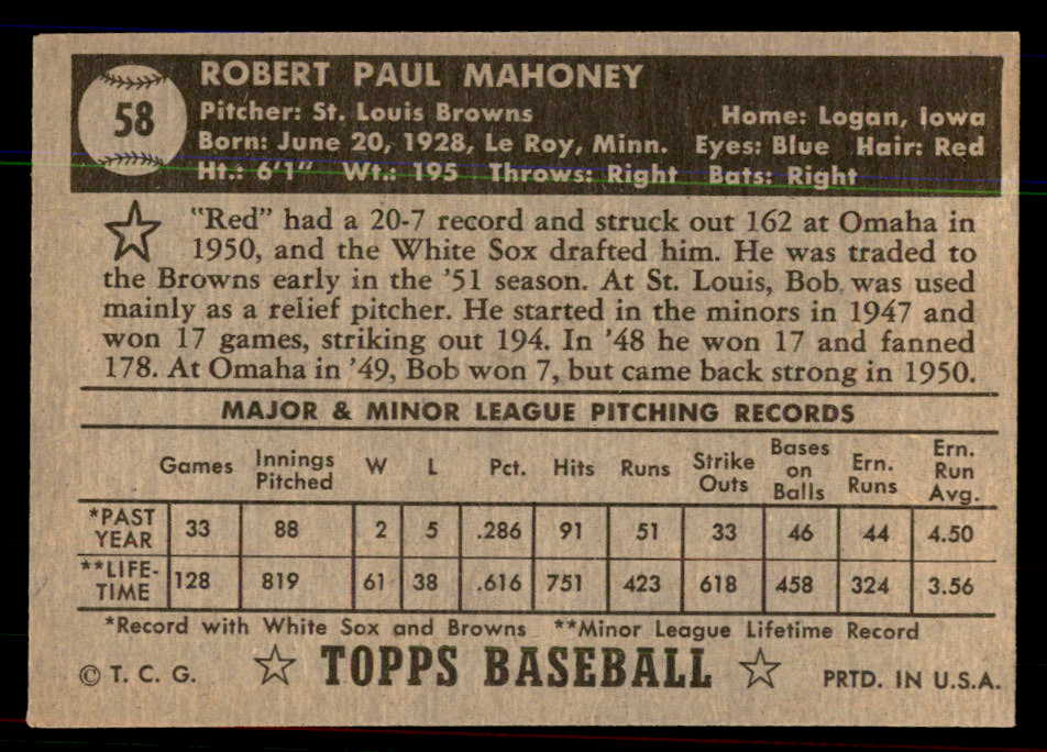 1952 Topps Baseball #058 Bob Mahoney Browns EX-MT Black 544141