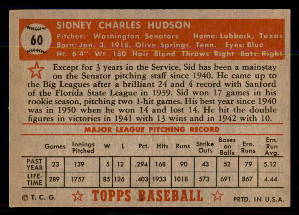 1952 Topps Baseball #060 Sid Hudson Senators EX-MT Red 544142