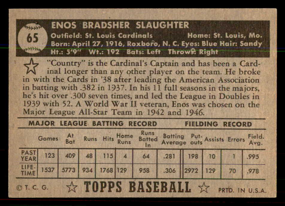 1952 Topps Baseball #065 Enos Slaughter Cardinals EX-MT Black 544146