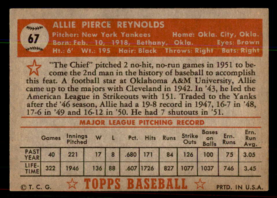 1952 Topps Baseball #067 Allie Reynolds Yankees EX-MT Red 544148