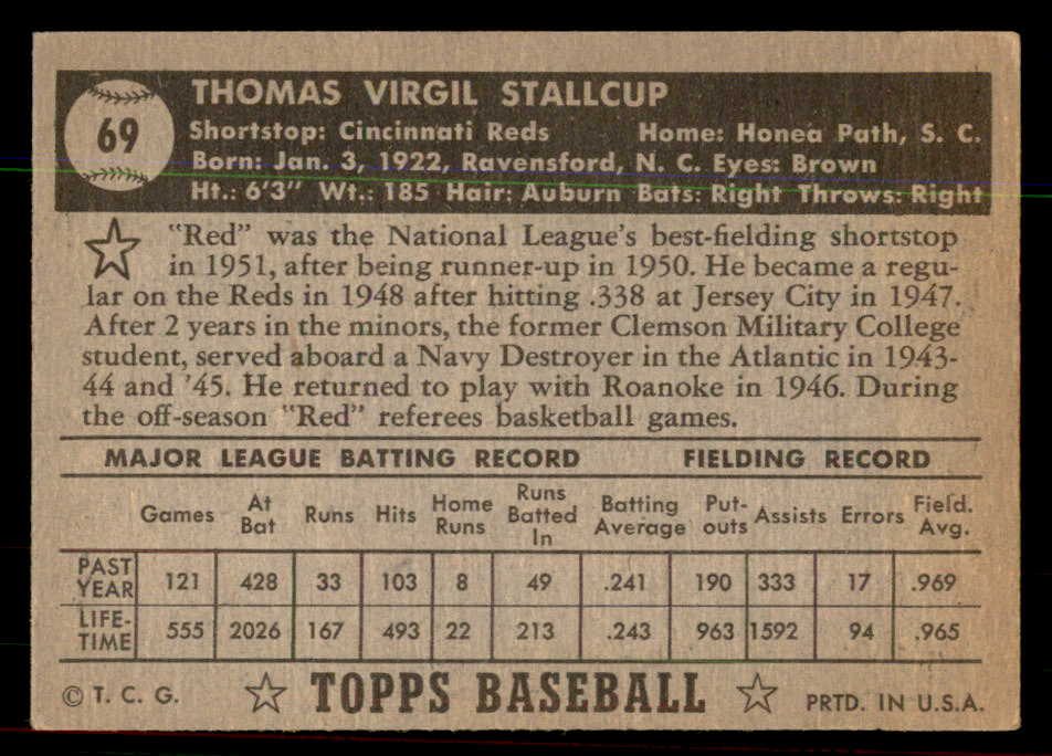 1952 Topps Baseball #069 Virgil Stallcup Reds EX-MT Black 544150