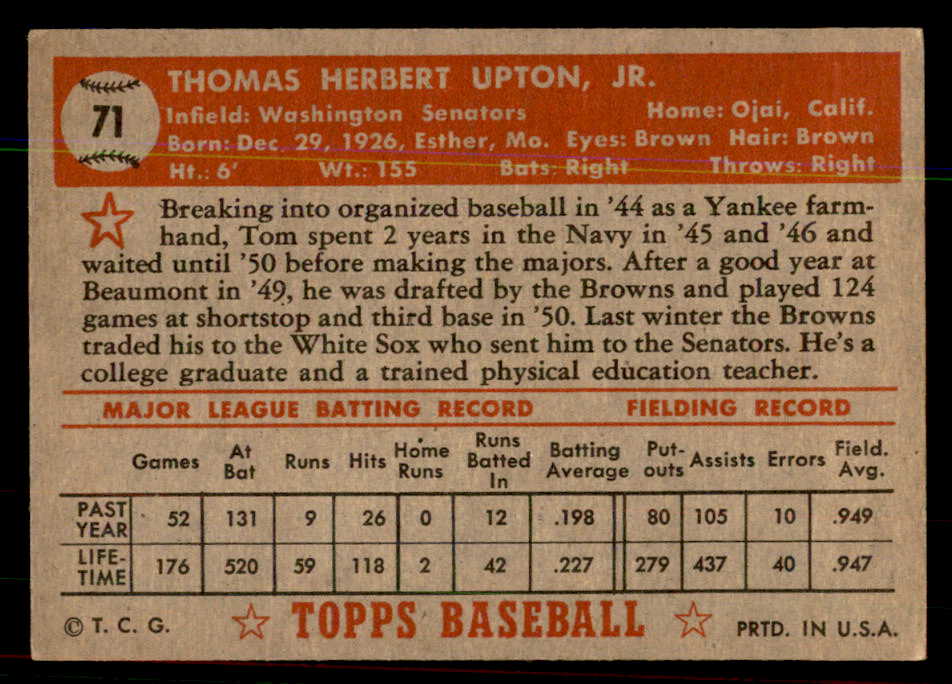 1952 Topps Baseball #071 Tom Upton Senators EX-MT Red 544151