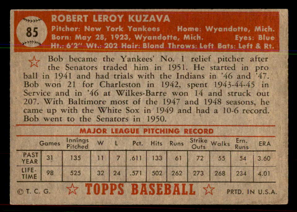 1952 Topps Baseball #085 Bob Kuzava Yankees VG-EX 544161